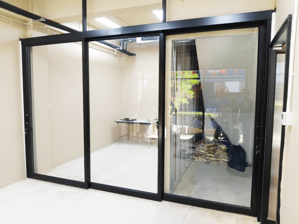 ติดตั้งกระจกอลูมิเนียมบานเฟรมเลื่อน และสามารถพับเก็บได้