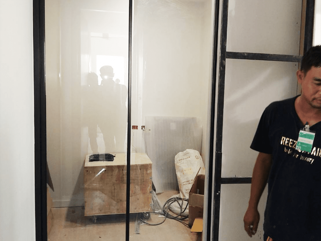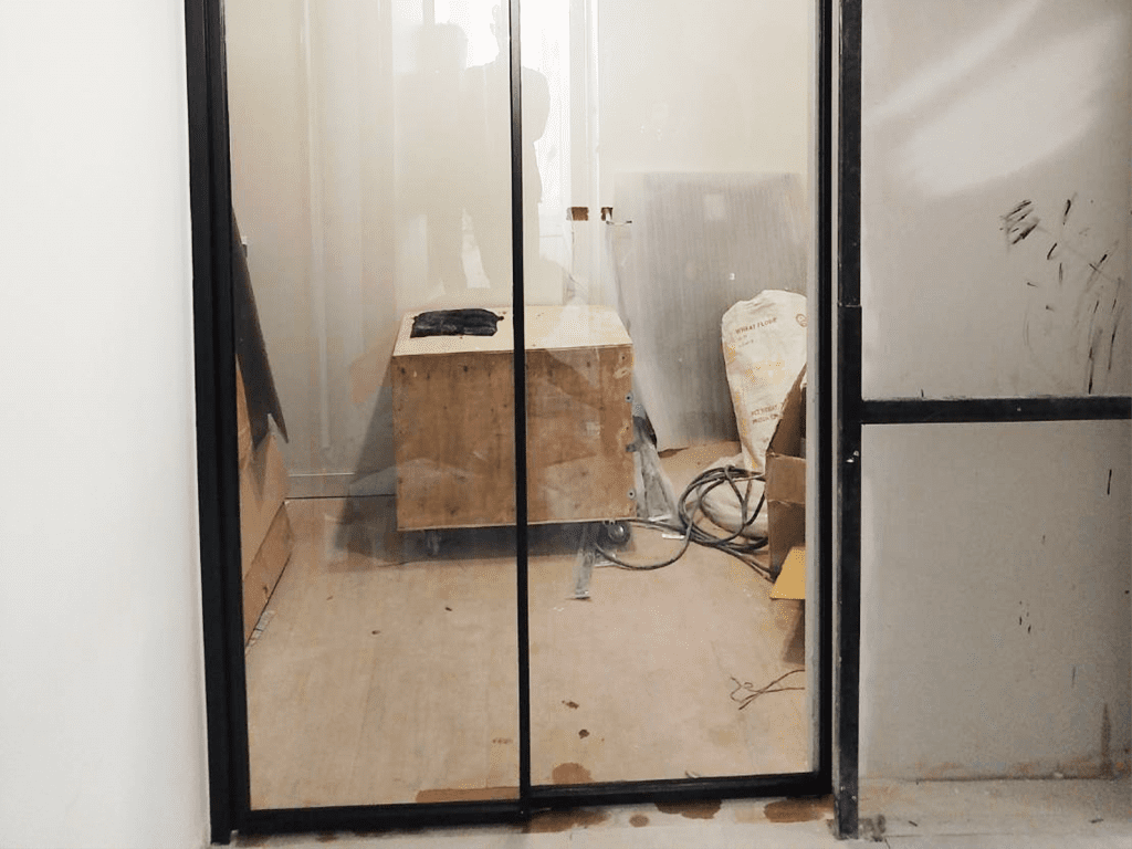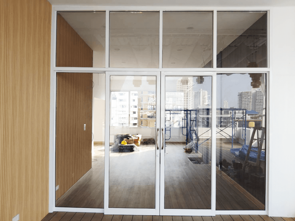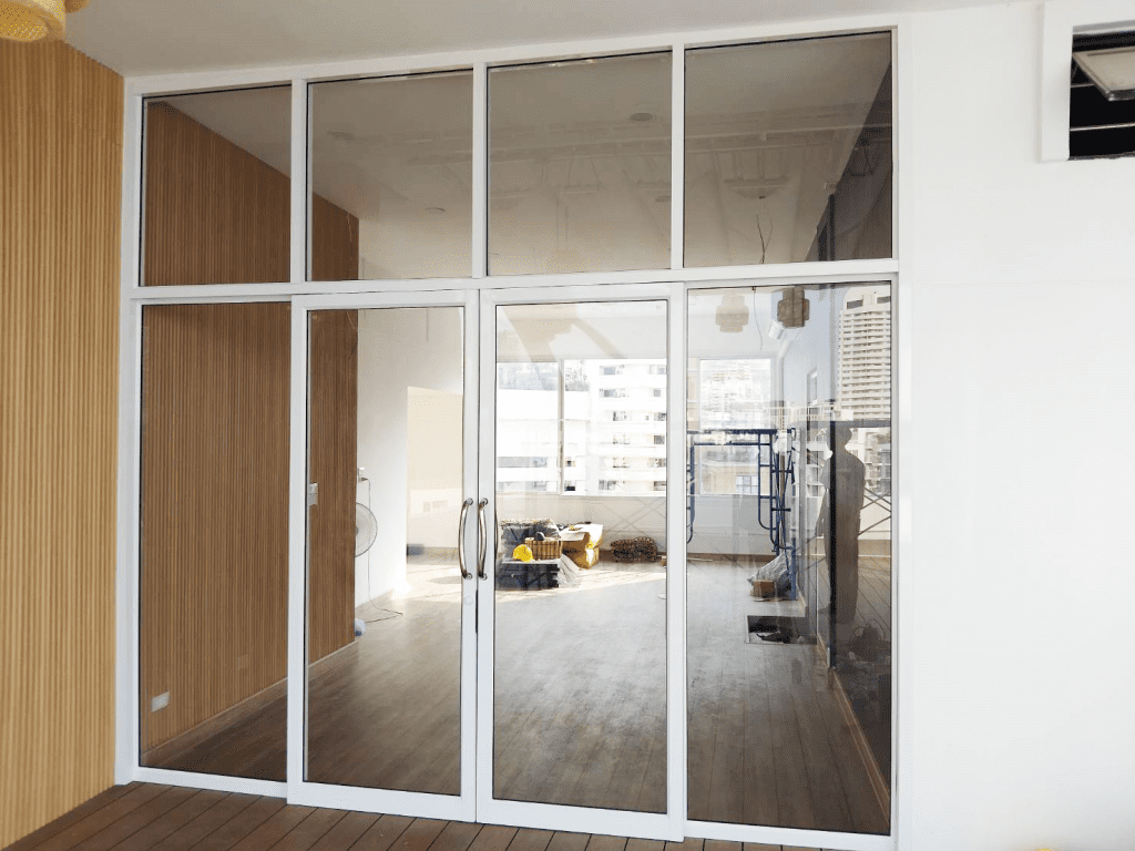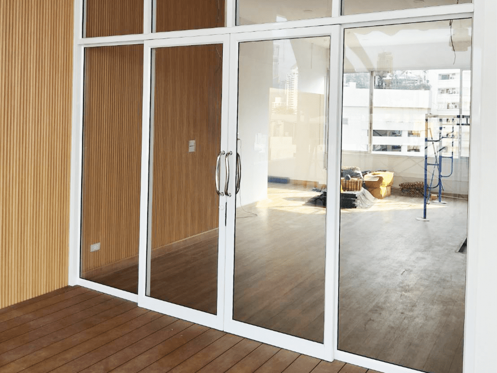 ตัวอย่างหน้างานสุขุมวิท ติดตั้งกระจกอลูมิเนียม ประตูสวิงอลูมิเนียมบานเฟรม