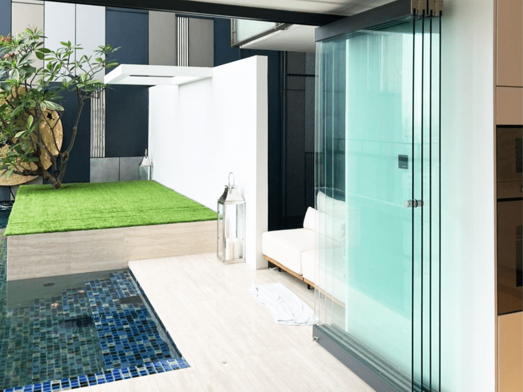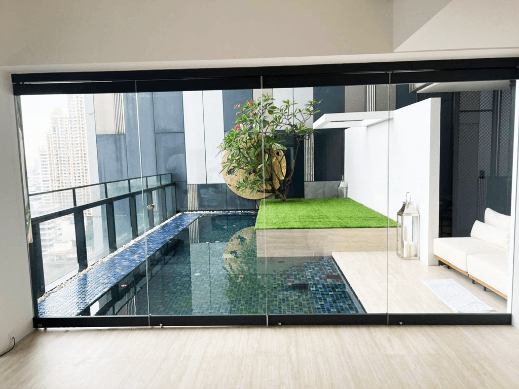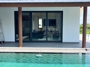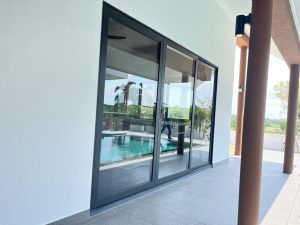 ตัวอย่างหน้างานพูลวิลล่า พัทยา ติดตั้งกระจกอลูมิเนียมชุดยูโรโปรไฟล์ทั้งหลัง